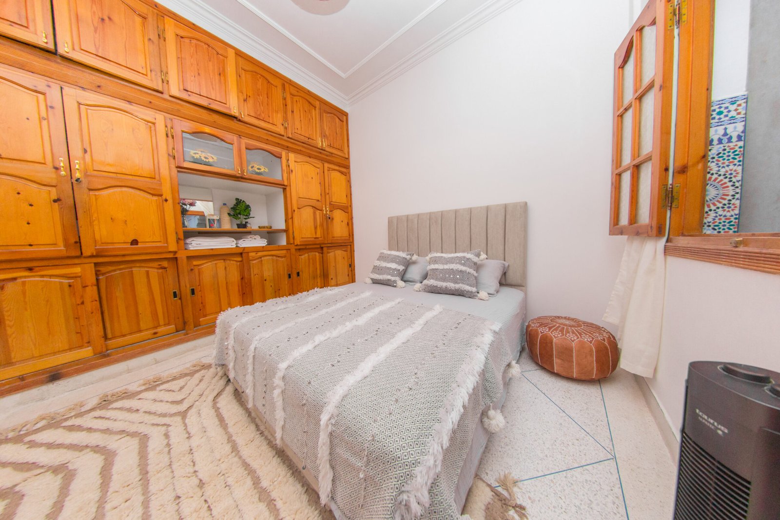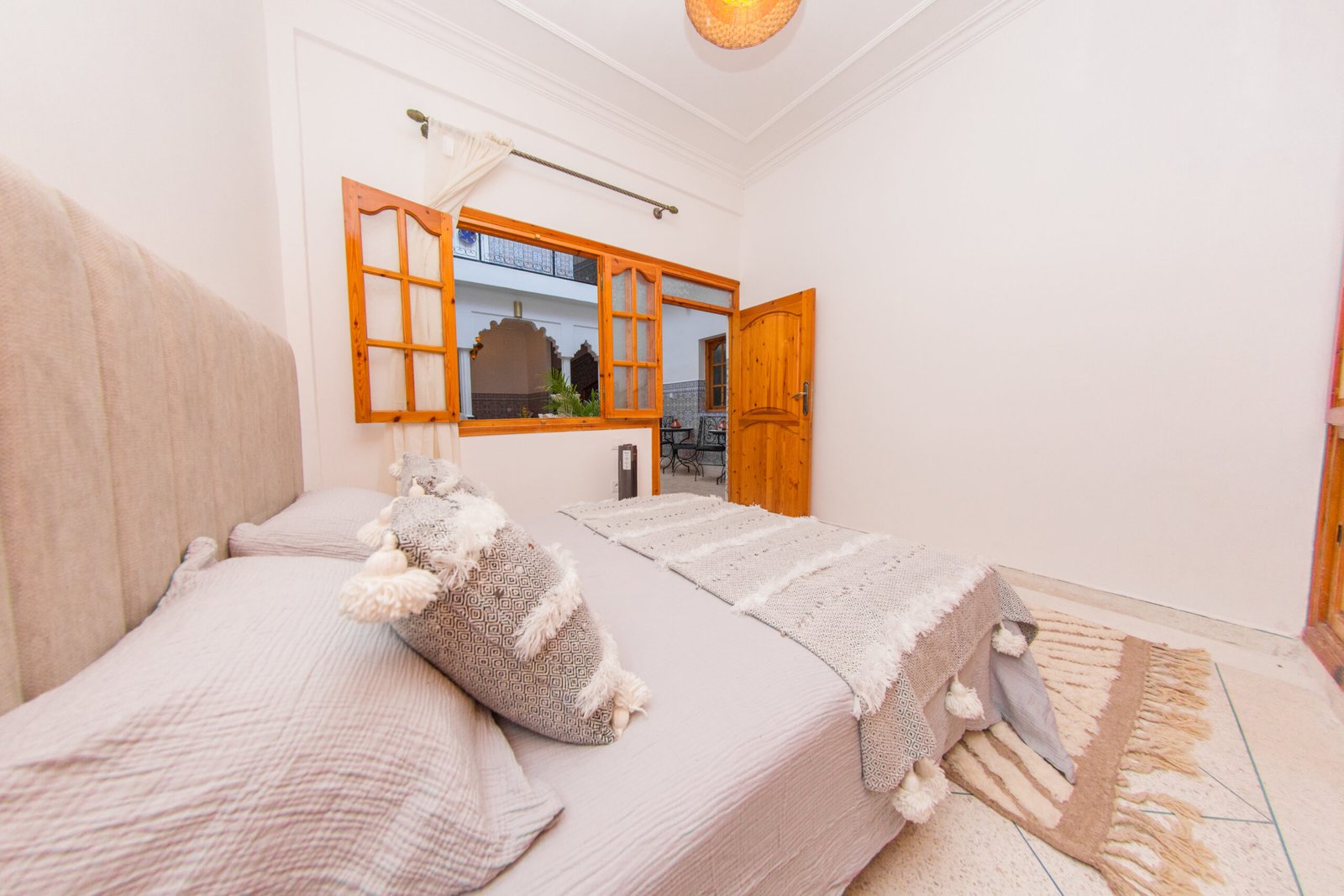 La Chambre Atlas incarne la sobriété et l’élégance du style marocain authentique. Elle dispose d’un confortable lit double orné de textiles traditionnels aux tons doux et apaisants. Sa grande armoire en bois massif offre un vaste espace de rangement, tandis que la fenêtre s’ouvre directement sur le patio, laissant entrer la lumière naturelle et le charme de la maison.